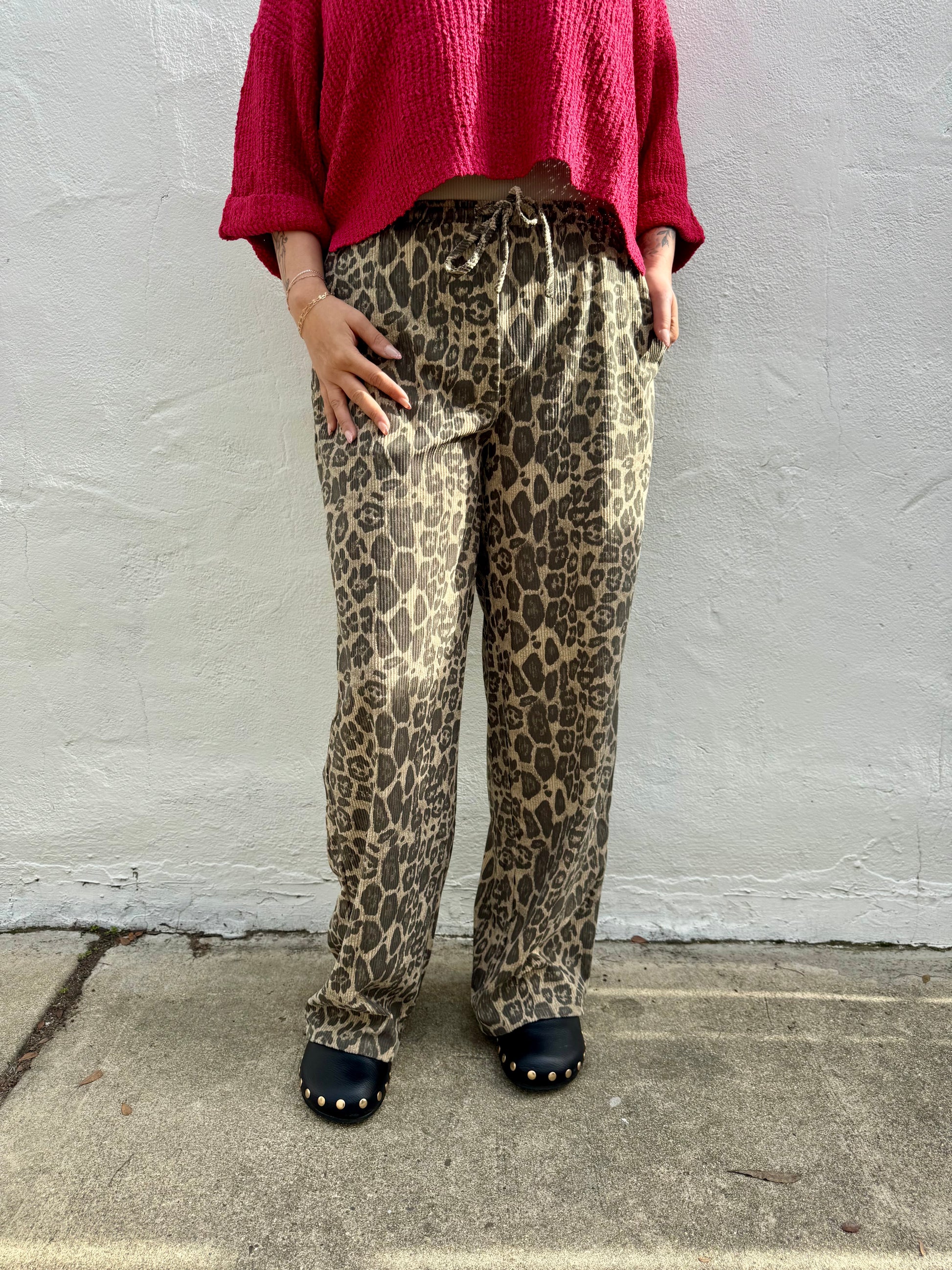 Stretchy Draw String Waist Corduroy Animal Print Wide Leg Pants; Size Down