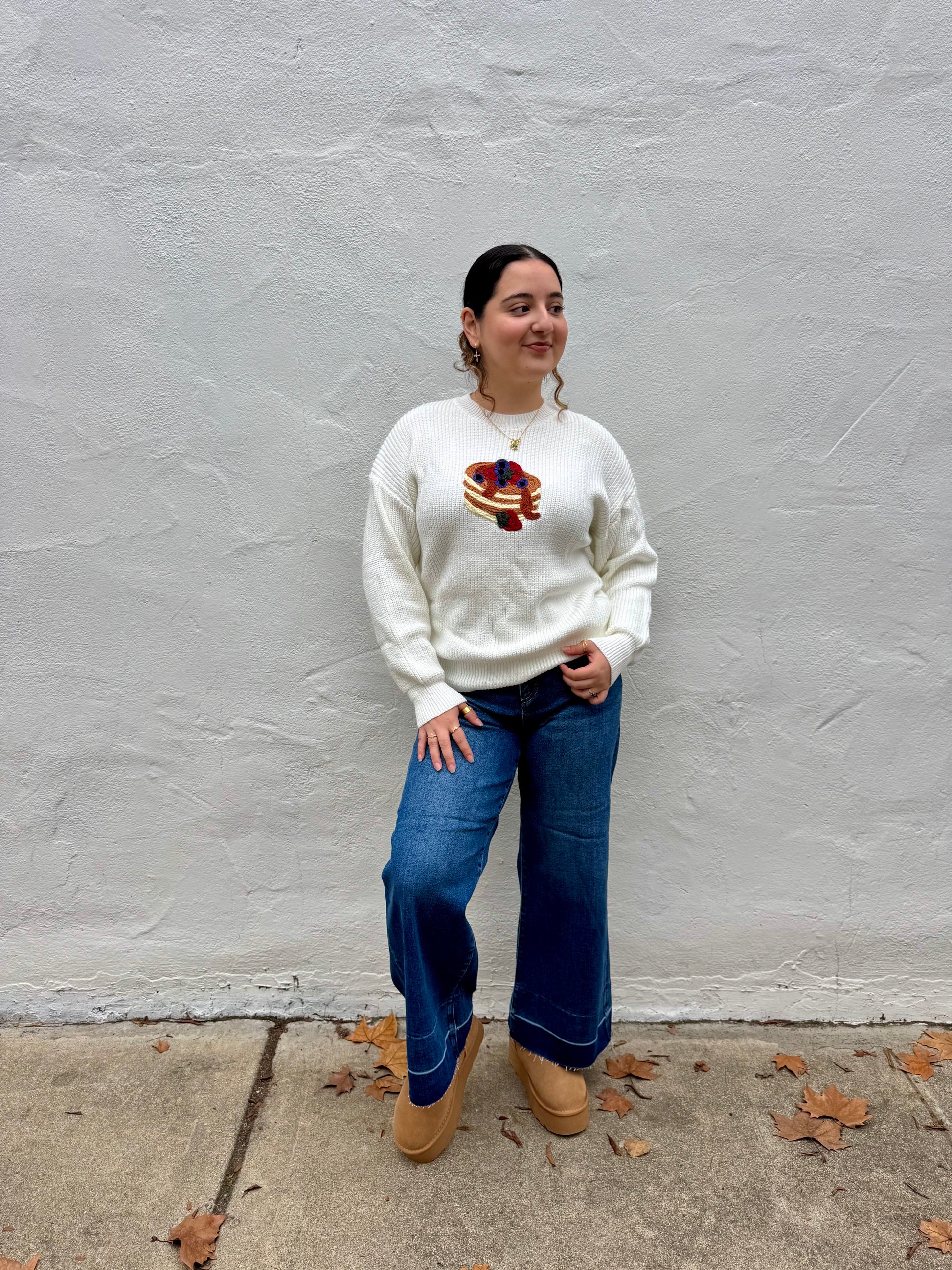 Round Neck Long Sleeve Pancake Aplique Sweater