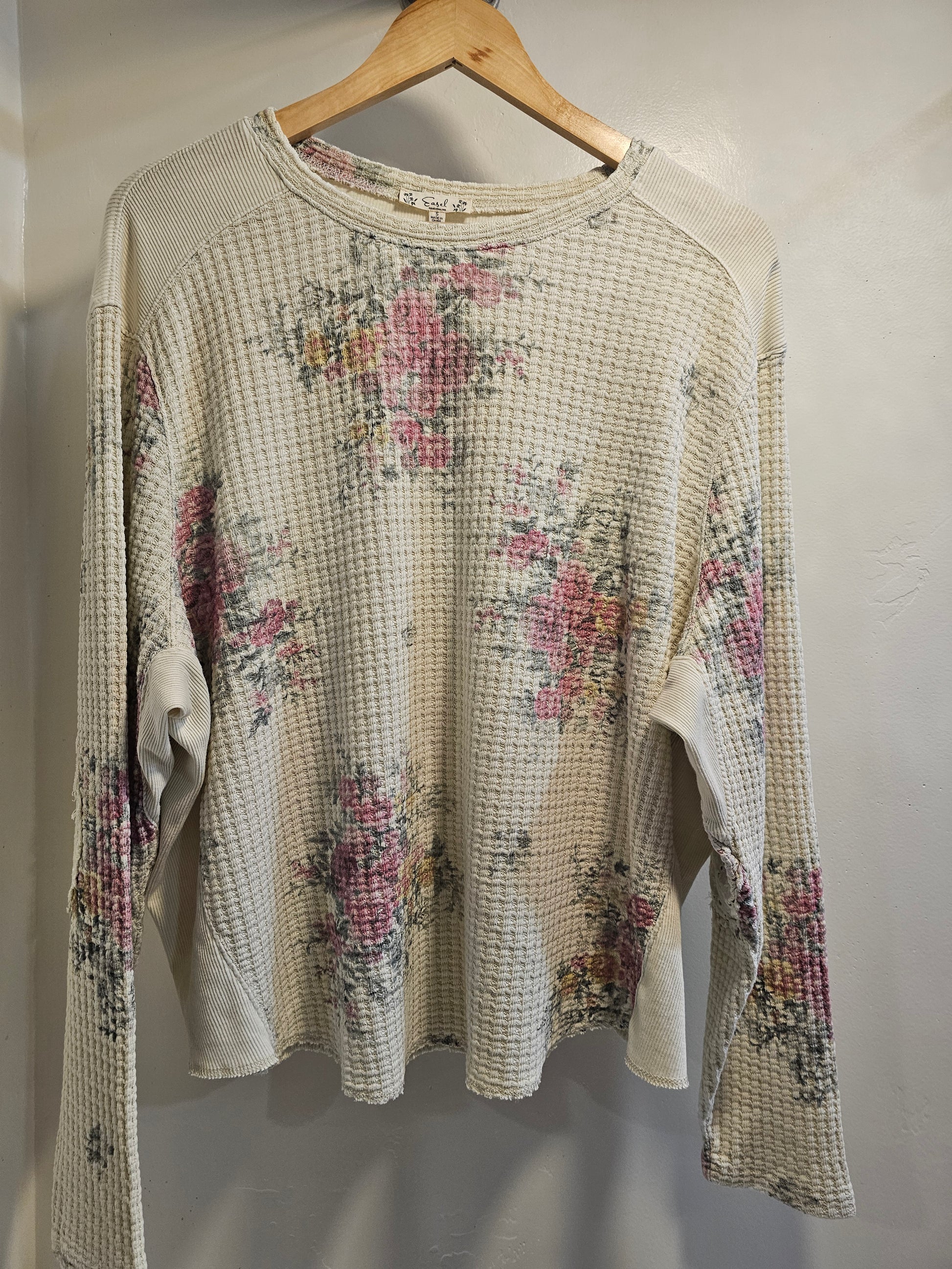 Floral Print Mineral Wash Waffle Knit Long Sleeve Top