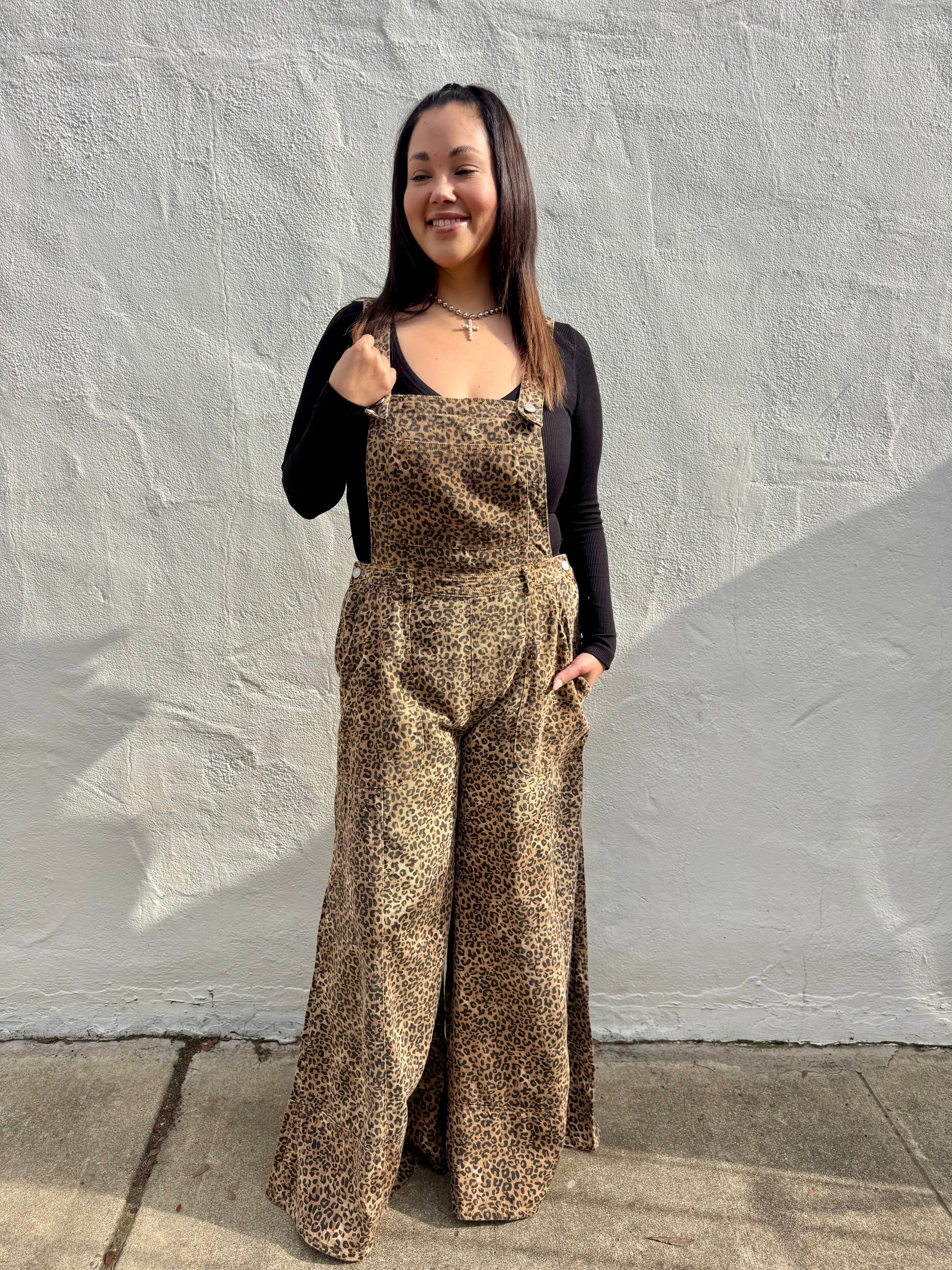 Taupe Animal Printed Denim Wide Open Leg Overall Pants; No Stretch True to Size