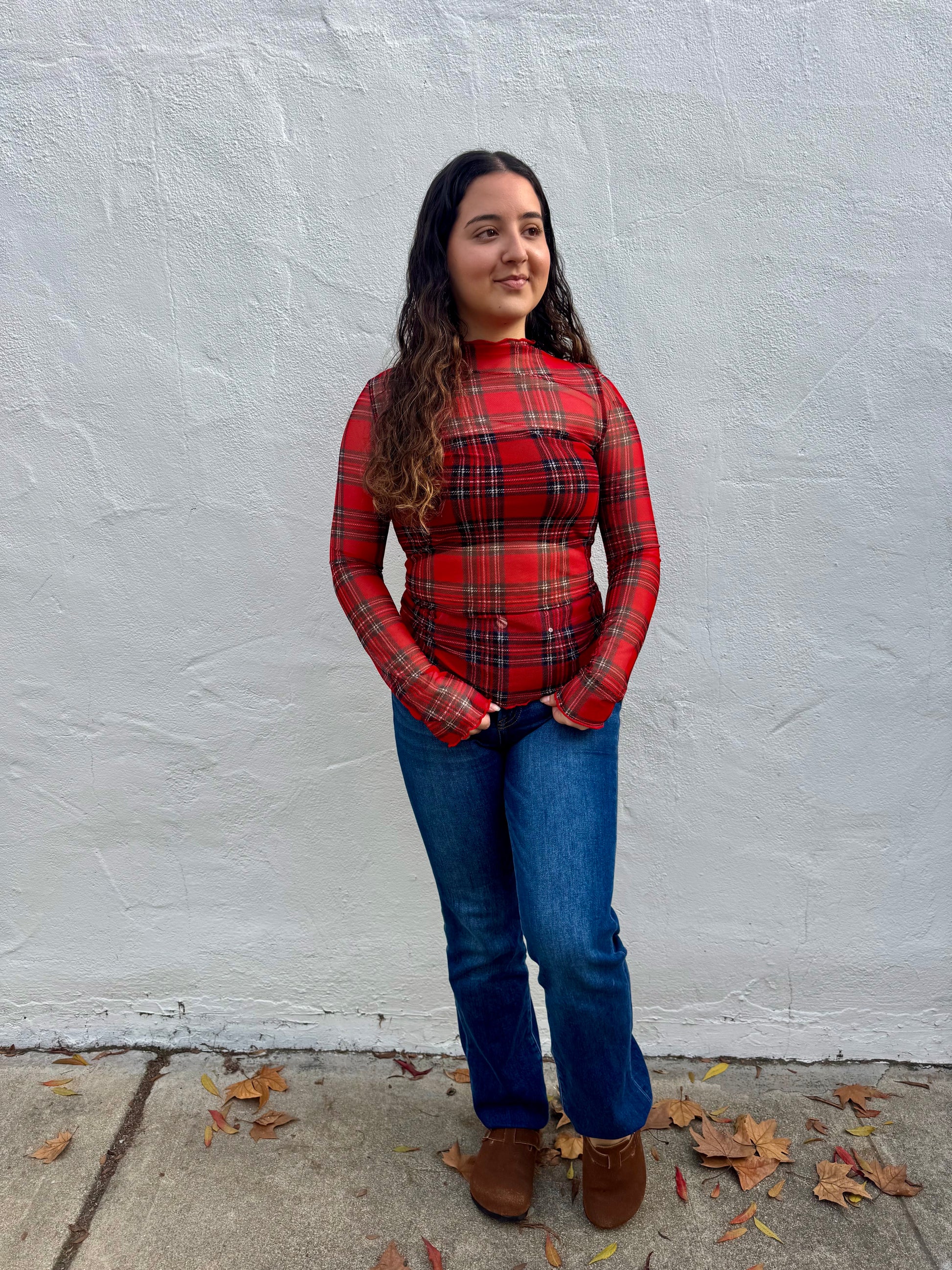 High Neck Line Long Sleeve Plaid Print Mesh Top
