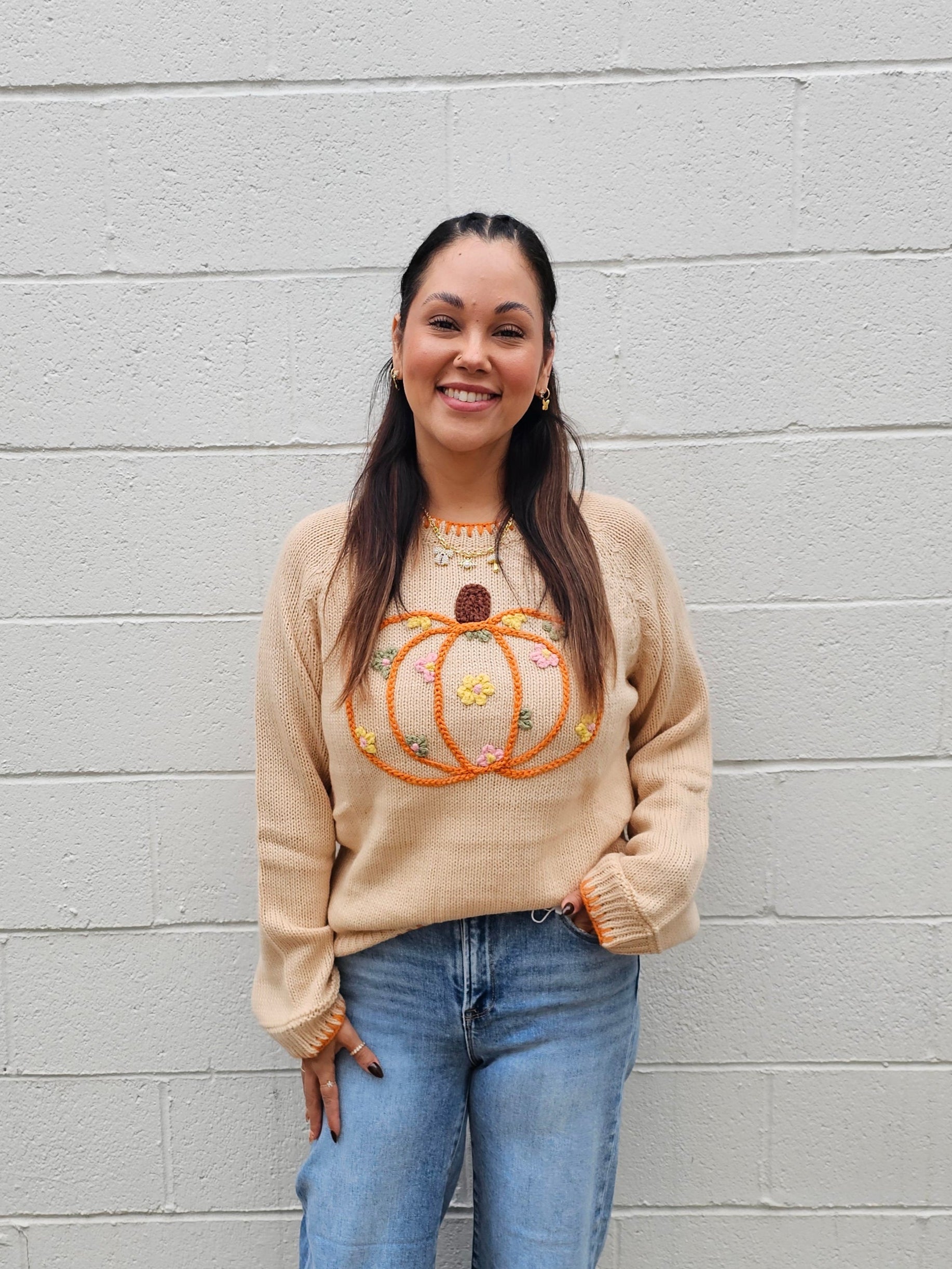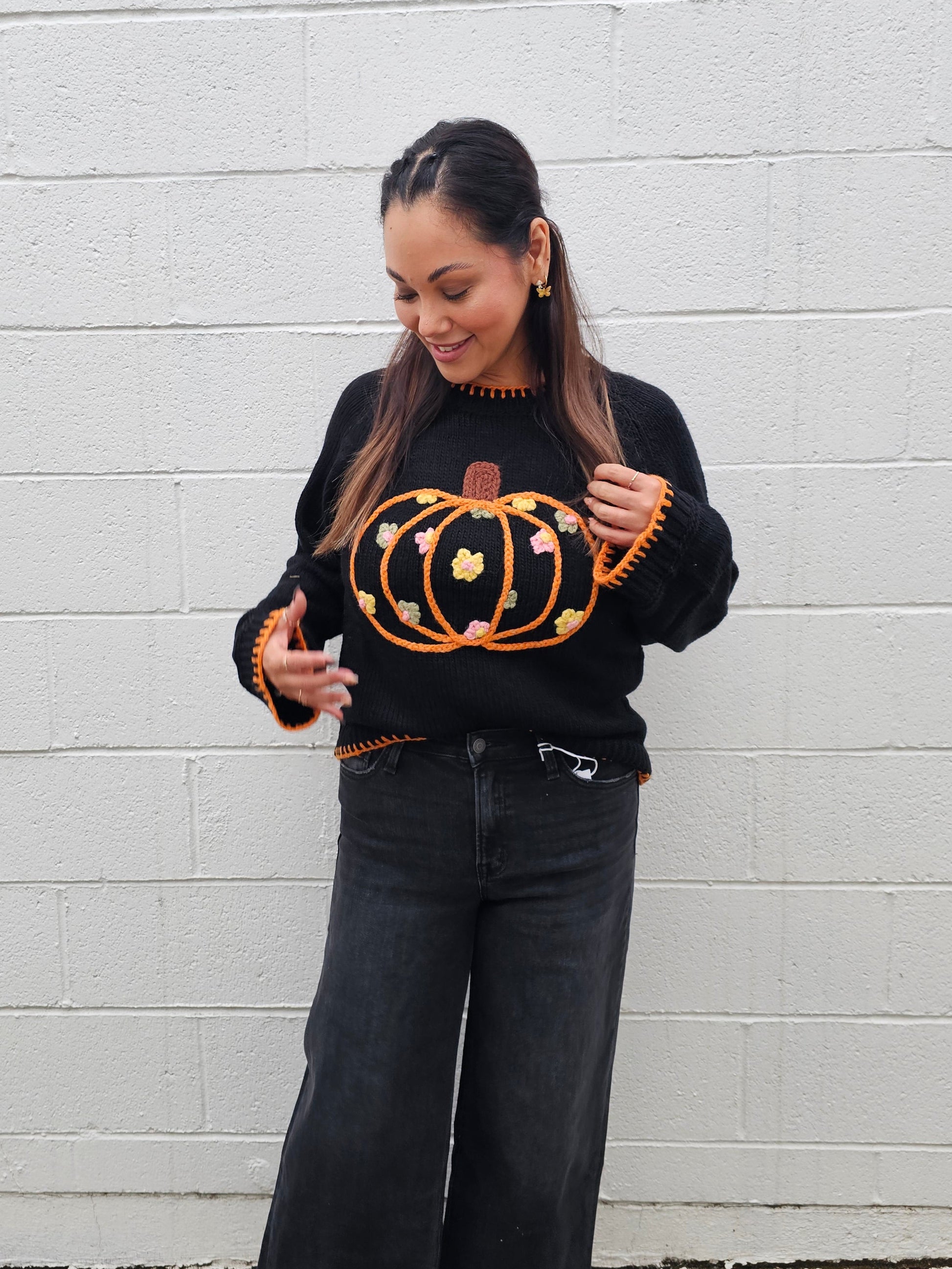 Pumpkin Floral Embroidered Sweater Top with Blanket Stitch