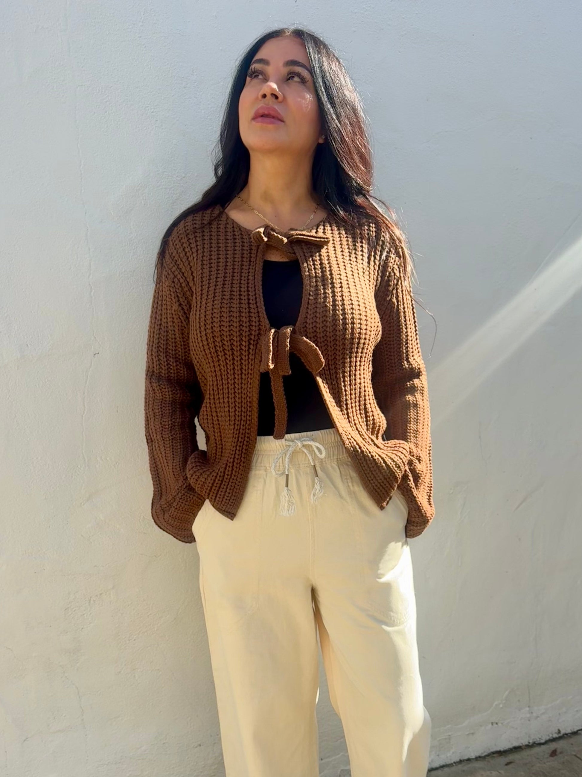 Solid Loose Gauge Knit Sweater Top with Bow Tied Closure