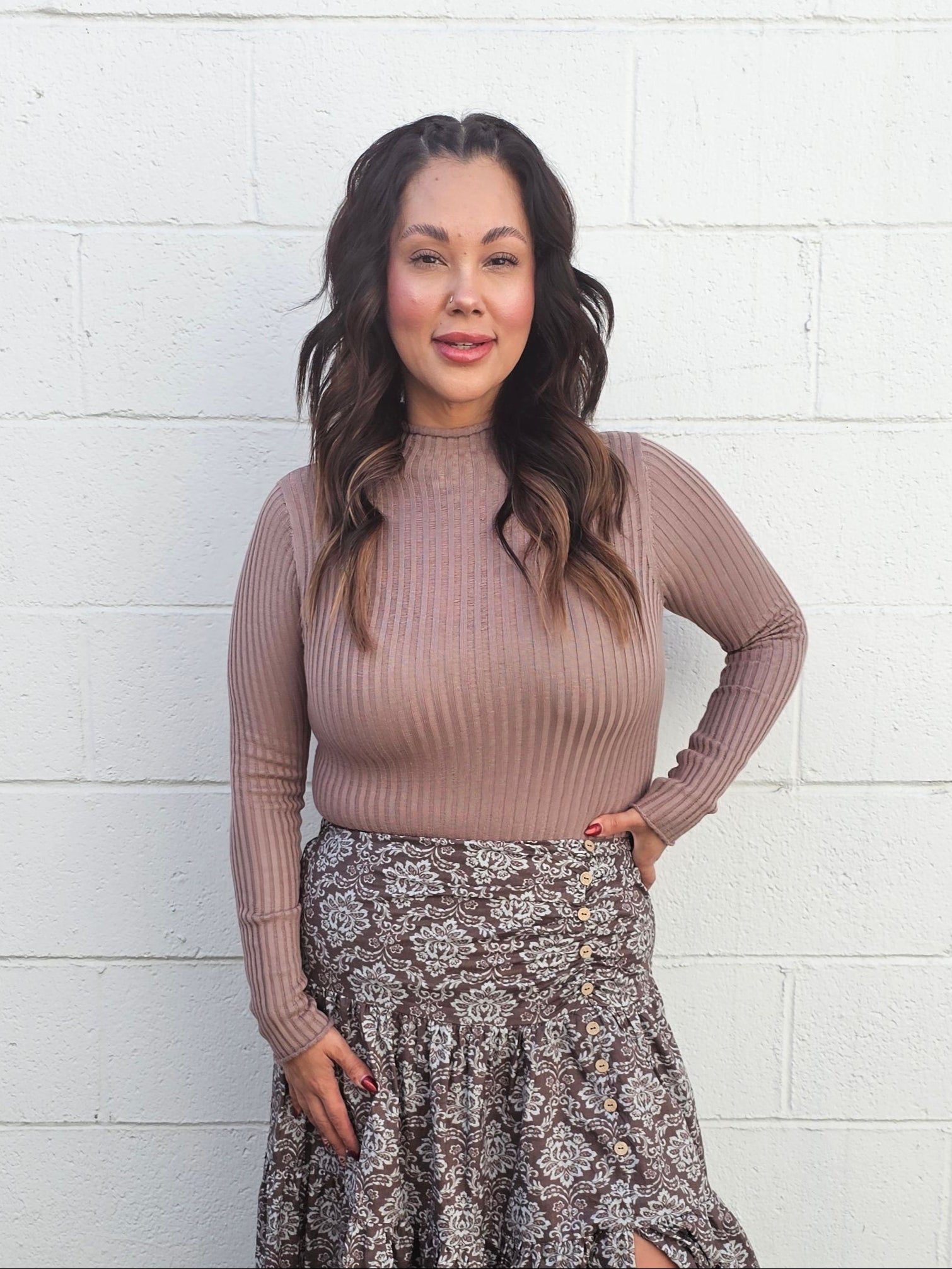 Turtle Neck Lettuce Trimming Long Sleeve Ribbed Top