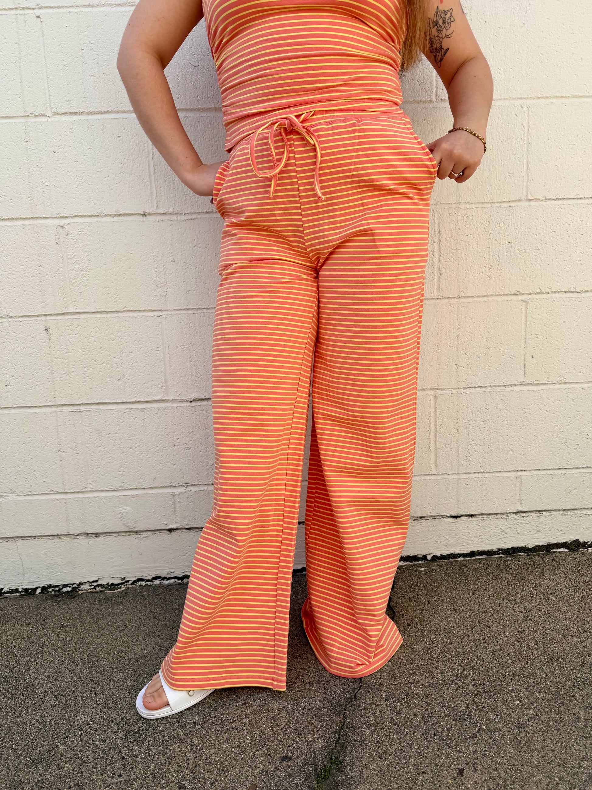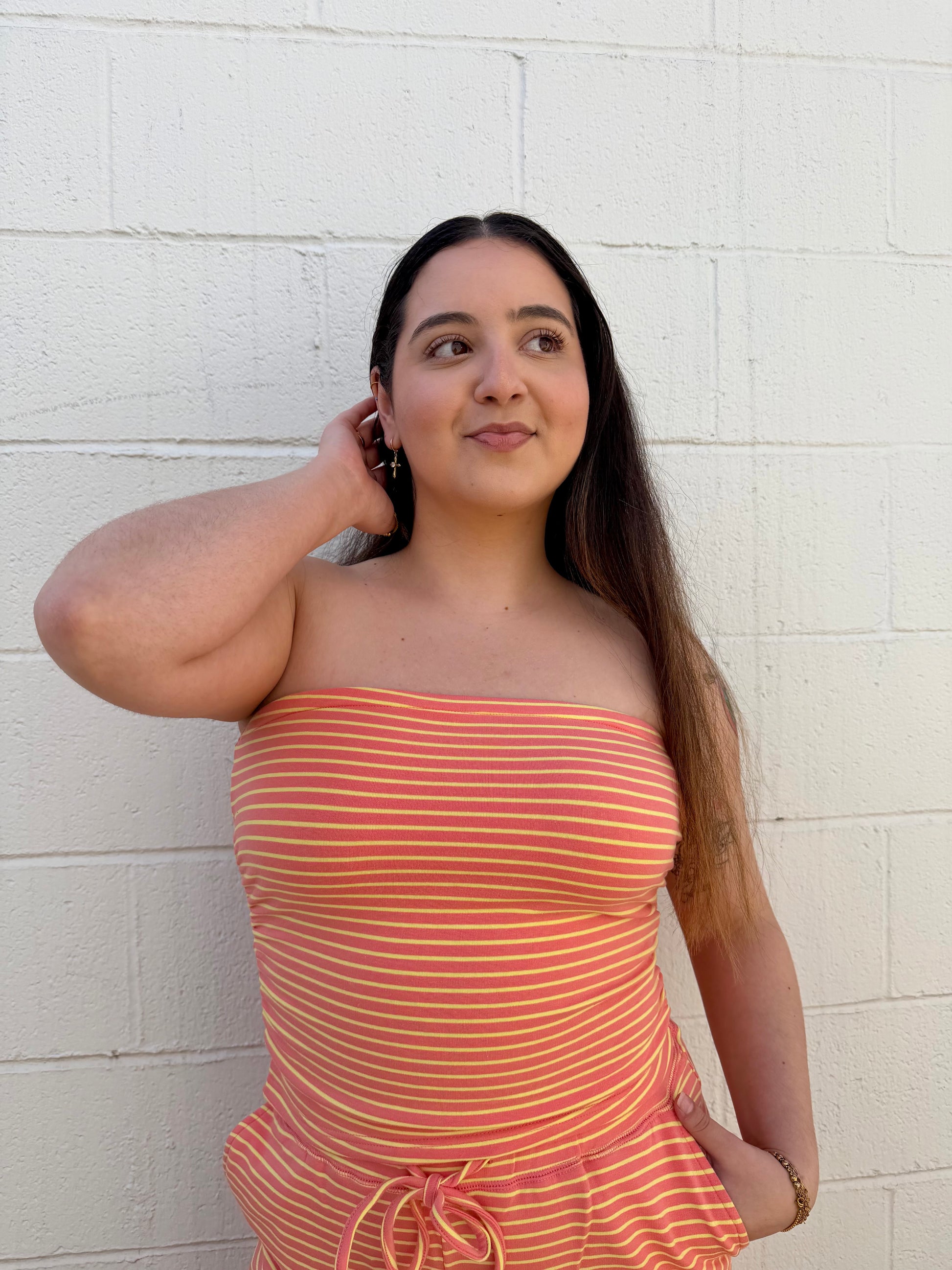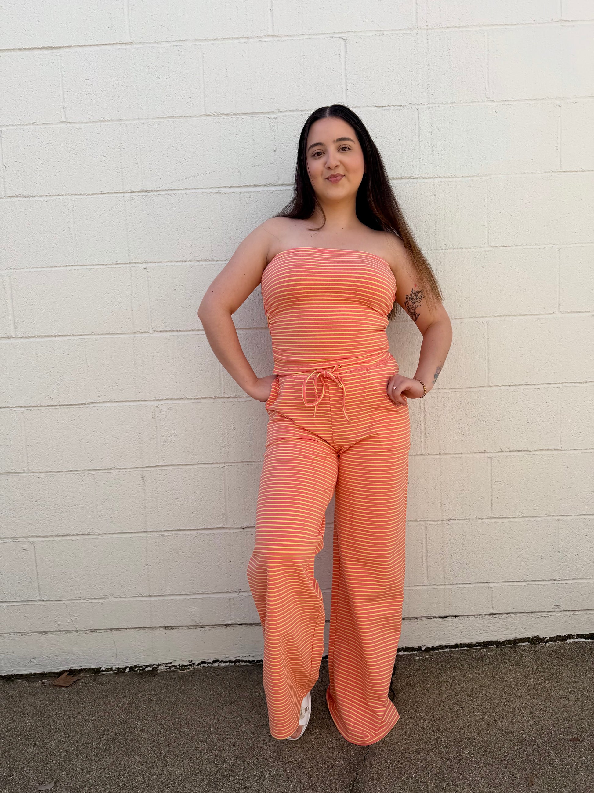 Striped Print Smocked Back Tube Top and Pants Set; Relaxed Fit