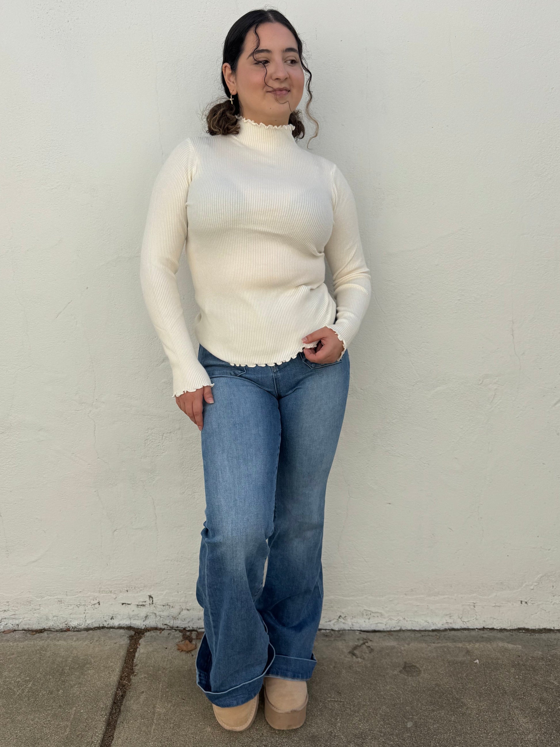 Long Sleeve Ribbed Turtle Neck Lettuce Trim