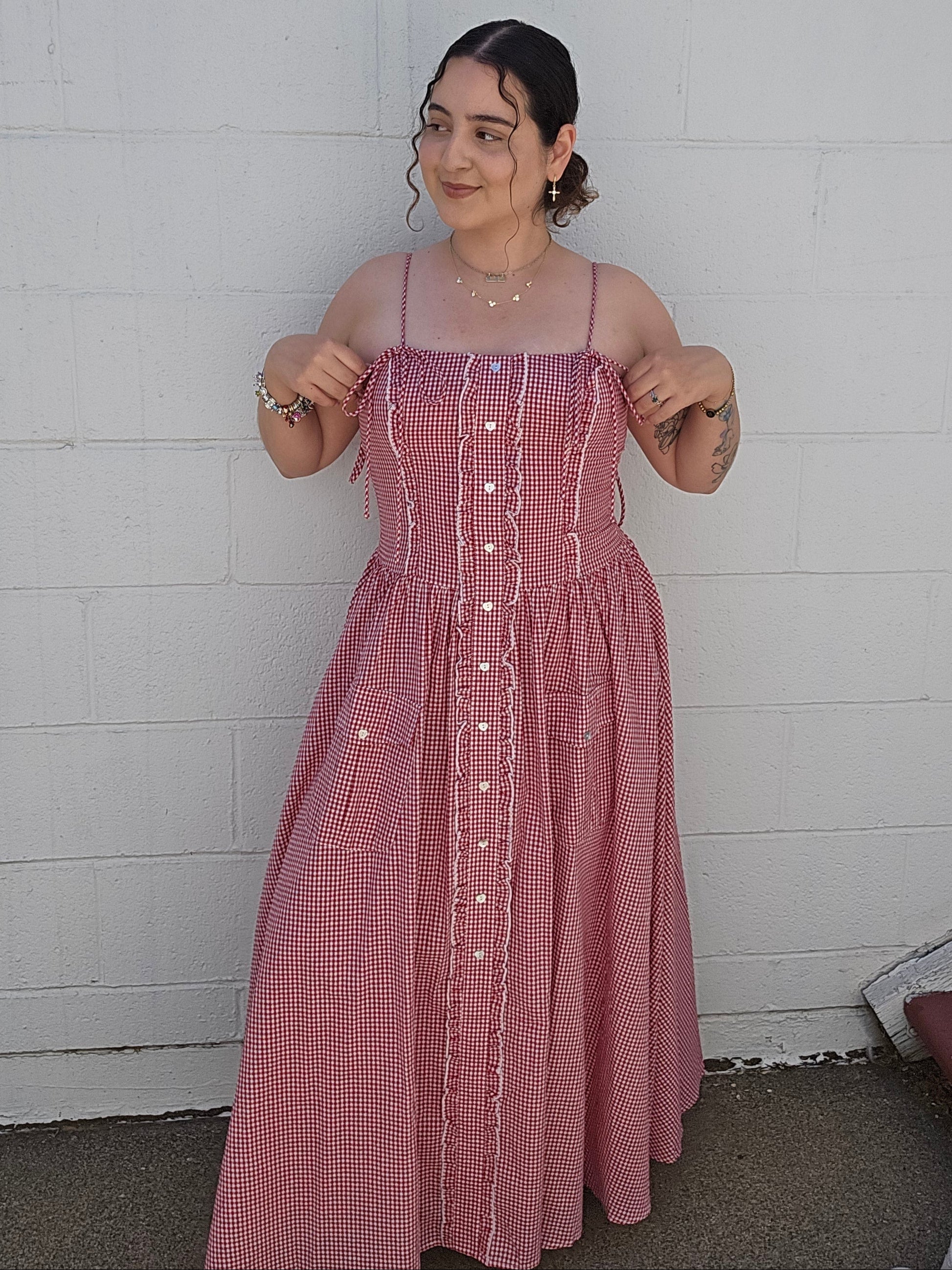 Ruffle Placket Gingham Midi Dress with Front Pockets and Heart Buttons