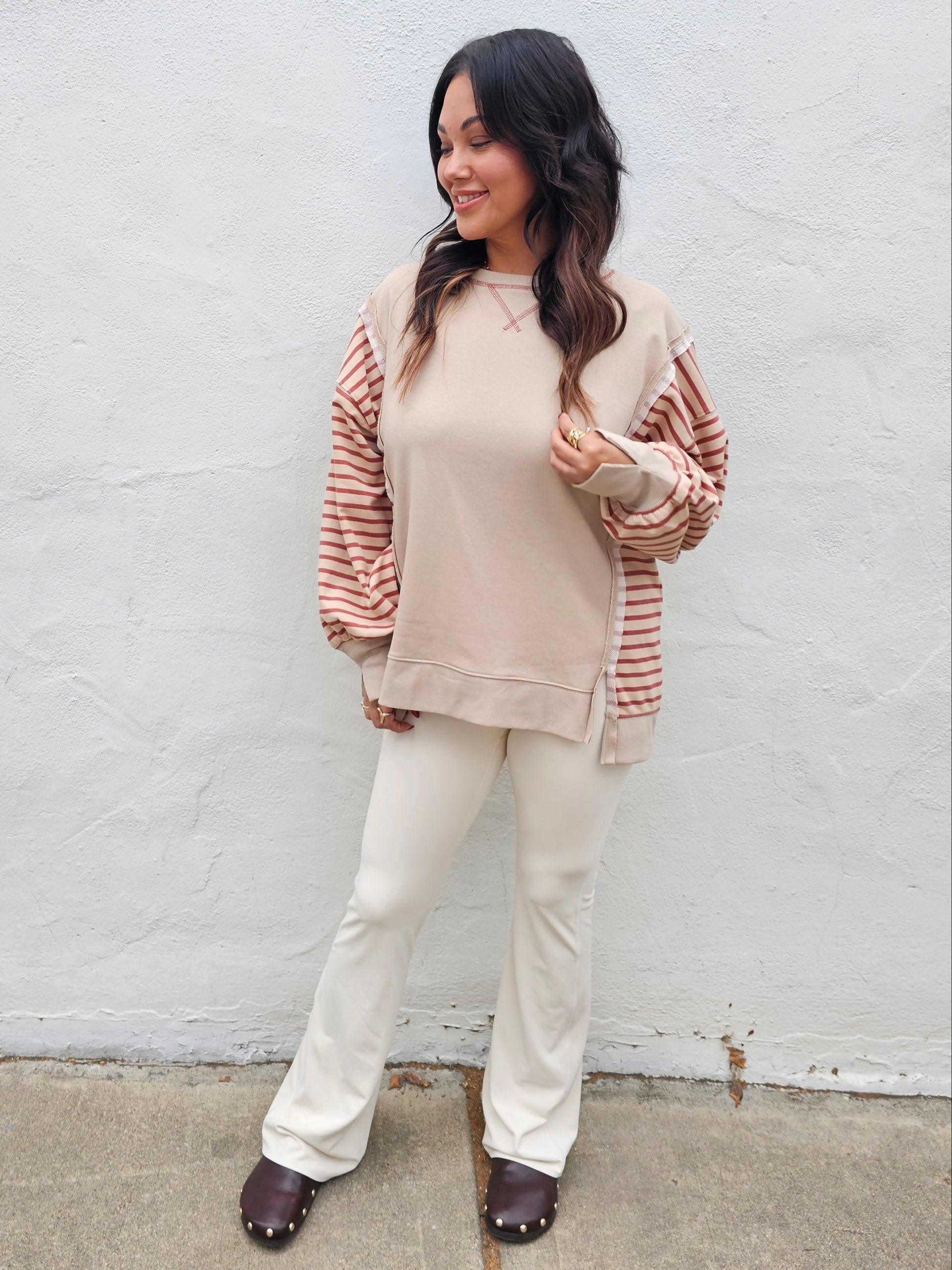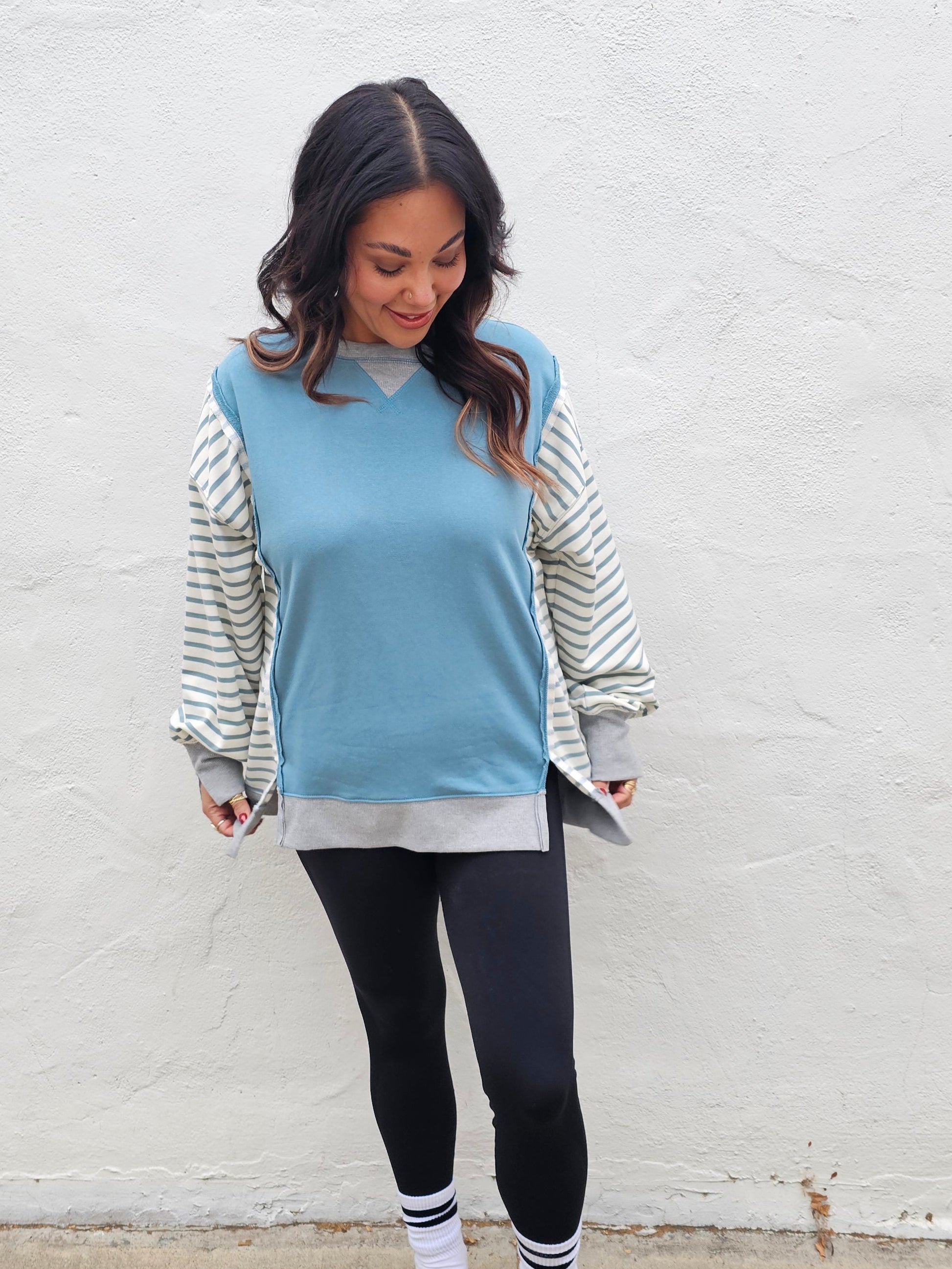 Striped Sleeves Raw Hem Detail High-Low Sweatshirt