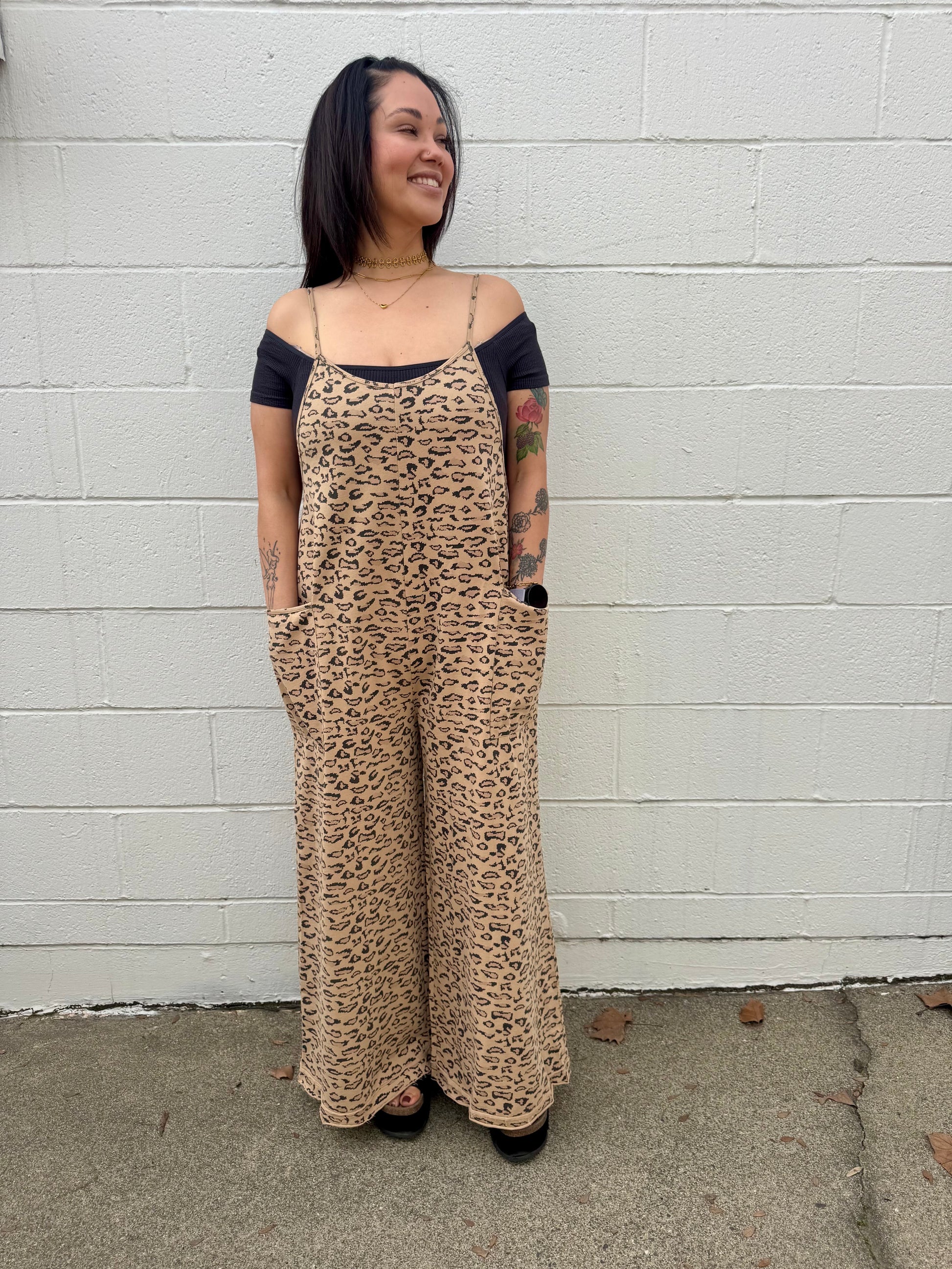 Animal Printed Spaghetti Strap Loose Fit Terry Knit Wide Leg Sweetheart Neckline Jumpsuit